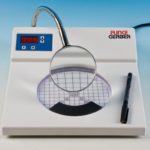 Para el conteo manual de colonias, en campo visual sensible a la presión con un diámetro de 145 mm, con iluminación LED directa e indirecta de bajo consumo, ajustable en luminosidad y tono luminoso, con indicador digital y retroalimentación acústica de conteo, caja regulable en altura, disco de Wolffhügel blanco y negro con divisiones de 1 y 1/9 cm². Lupa con brazo flexible (Ø 90 mm), 2 aumentos. Admite placas de Petri de hasta 145 mm; se suministra un inserto reductor para placas de Petri más pequeñas.